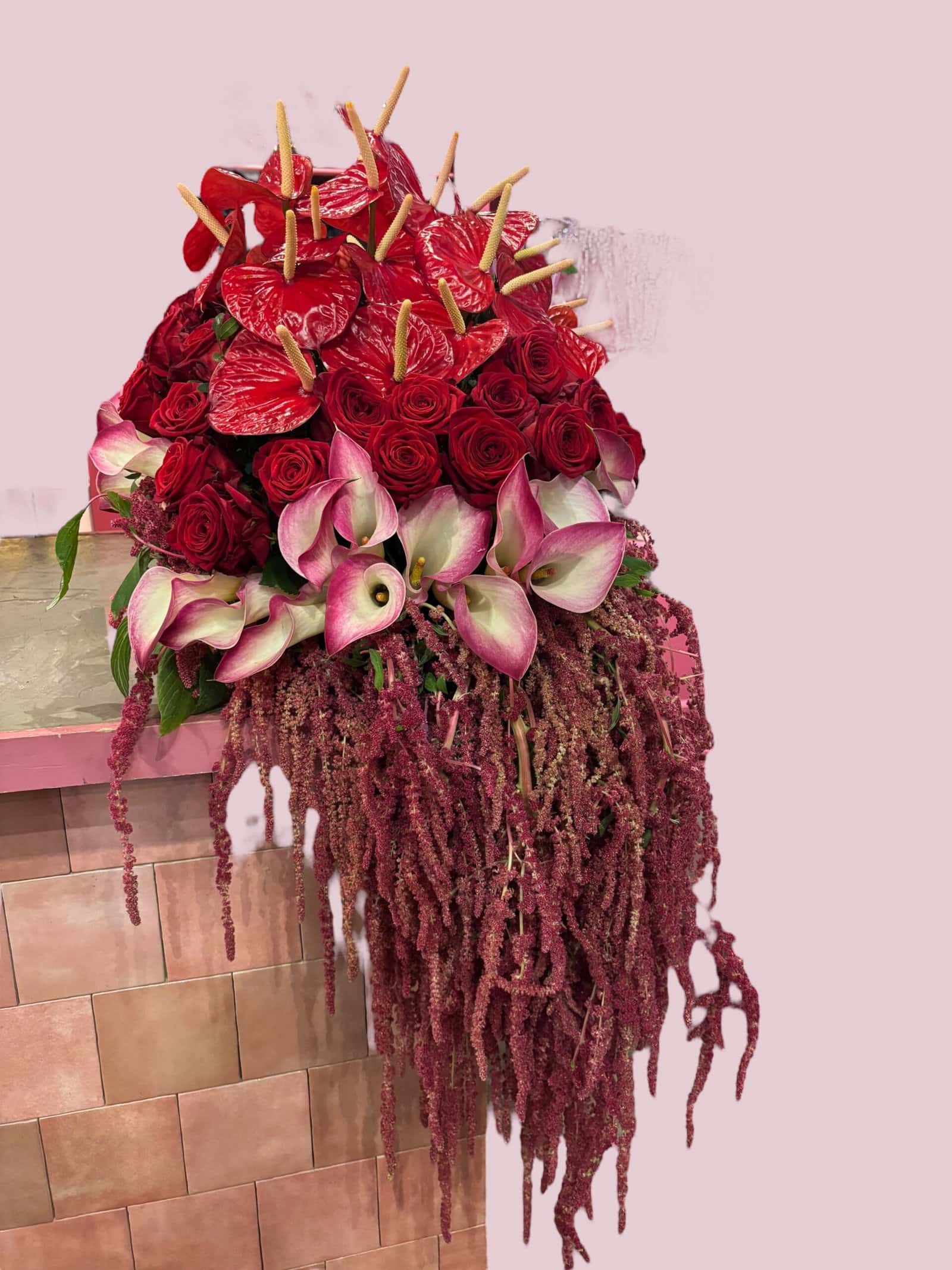 Hoe gaaf is dit bloemstuk! Hangend Pracht is een spectaculair en exclusief bloemstuk dat letterlijk de aandacht trekt. Gemaakt met dieprode rozen, anthuriums en sierlijke, hangende amaranthus, vormt dit stuk een echte blikvanger voor bijzondere momenten.