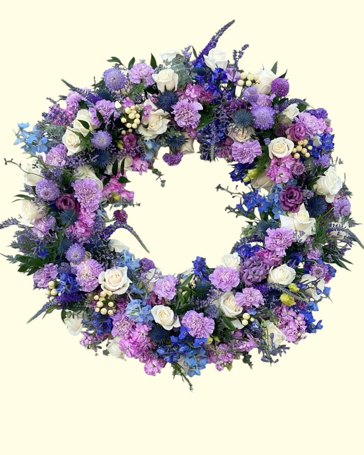 Onze verfijnde ajourkrans lila straalt klasse uit. Rijkelijk gevuld met hand gestoken zachte lila kleurige seizoens bloemen rondom een open, luchtige basis, biedt dit bloemwerk een serene uitstraling die perfect past bij elk afscheid.