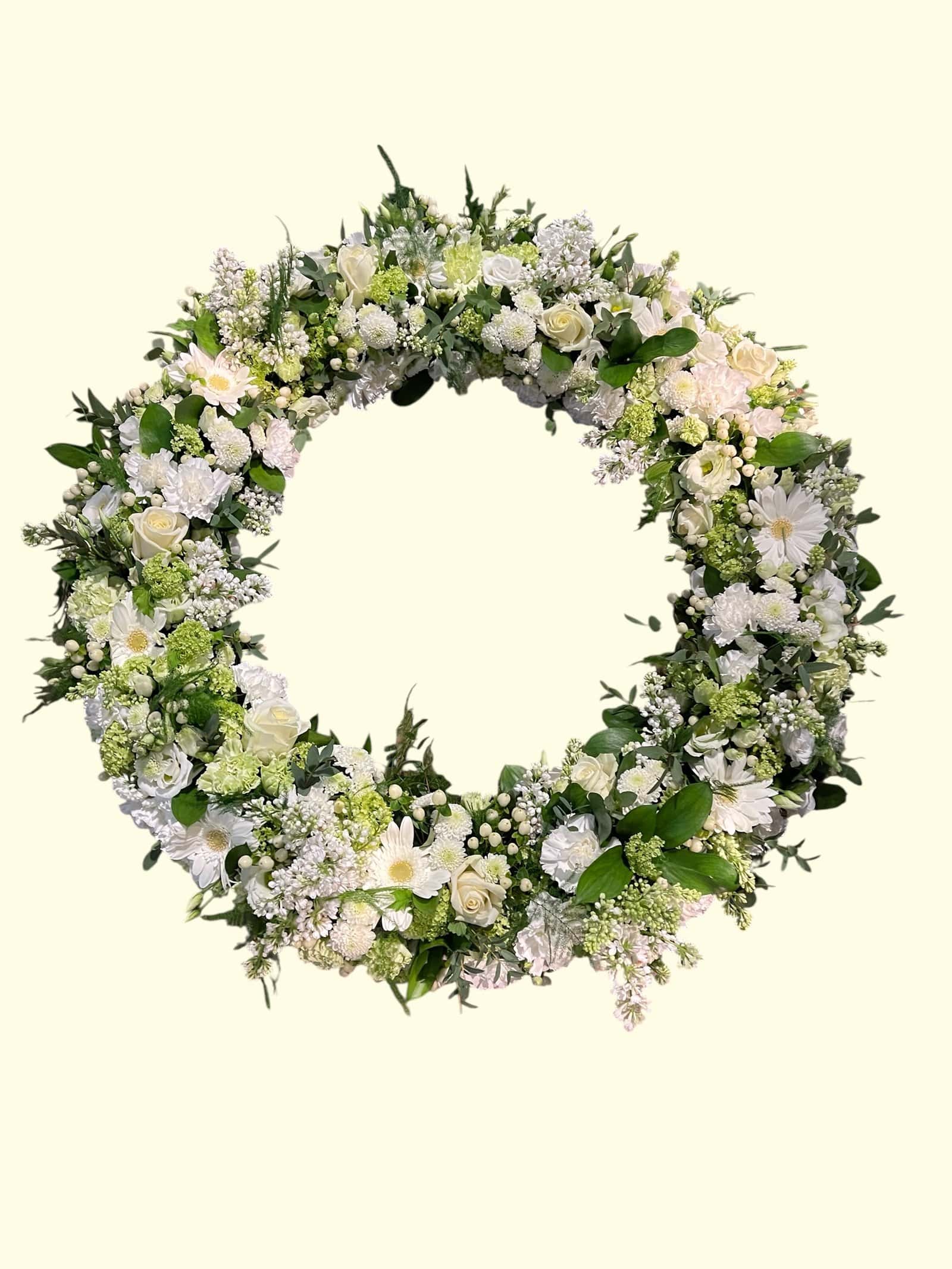 Onze vakkundige bloembinders in Den Haag steken de bloemen met precisie in vochtig steekschuim, waardoor de open structuur en de bloemcontouren prachtig behouden blijven. Het resultaat is een elegante krans waarin de diversiteit aan witte bloemen prachtig samenkomt.