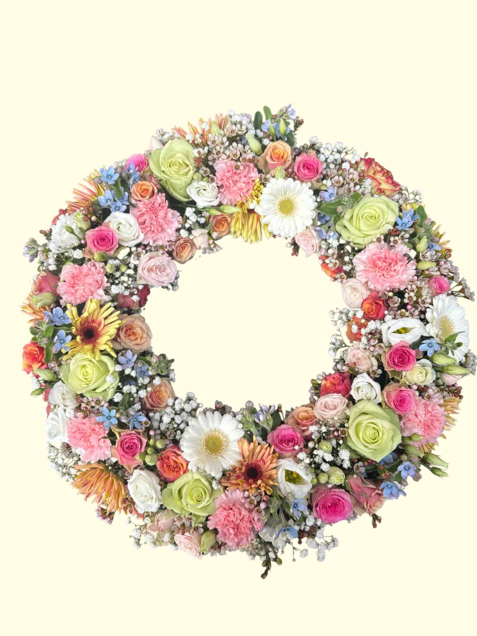 Onze verfijnde ajourkrans pastel straalt klasse uit. Rijkelijk gevuld met hand gestoken zachte pastel seizoens bloemen rondom een open, luchtige basis, biedt dit bloemwerk een serene uitstraling die perfect past bij elk afscheid.