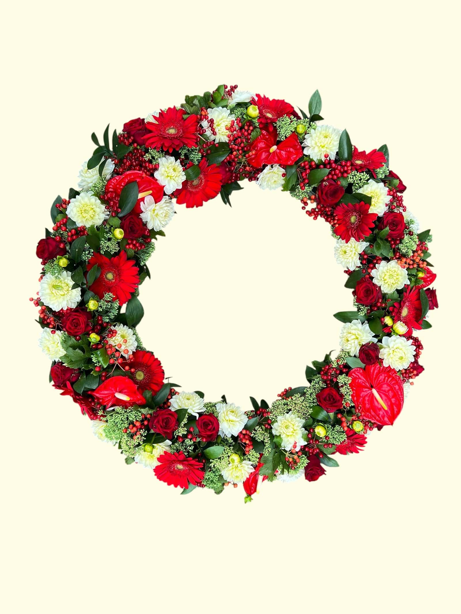 Onze verfijnde ajourkrans straalt klasse uit. Rijkelijk gevuld met vol rode bloemen rondom een open, luchtige basis, biedt dit bloemwerk een serene uitstraling die perfect past bij elk afscheid.