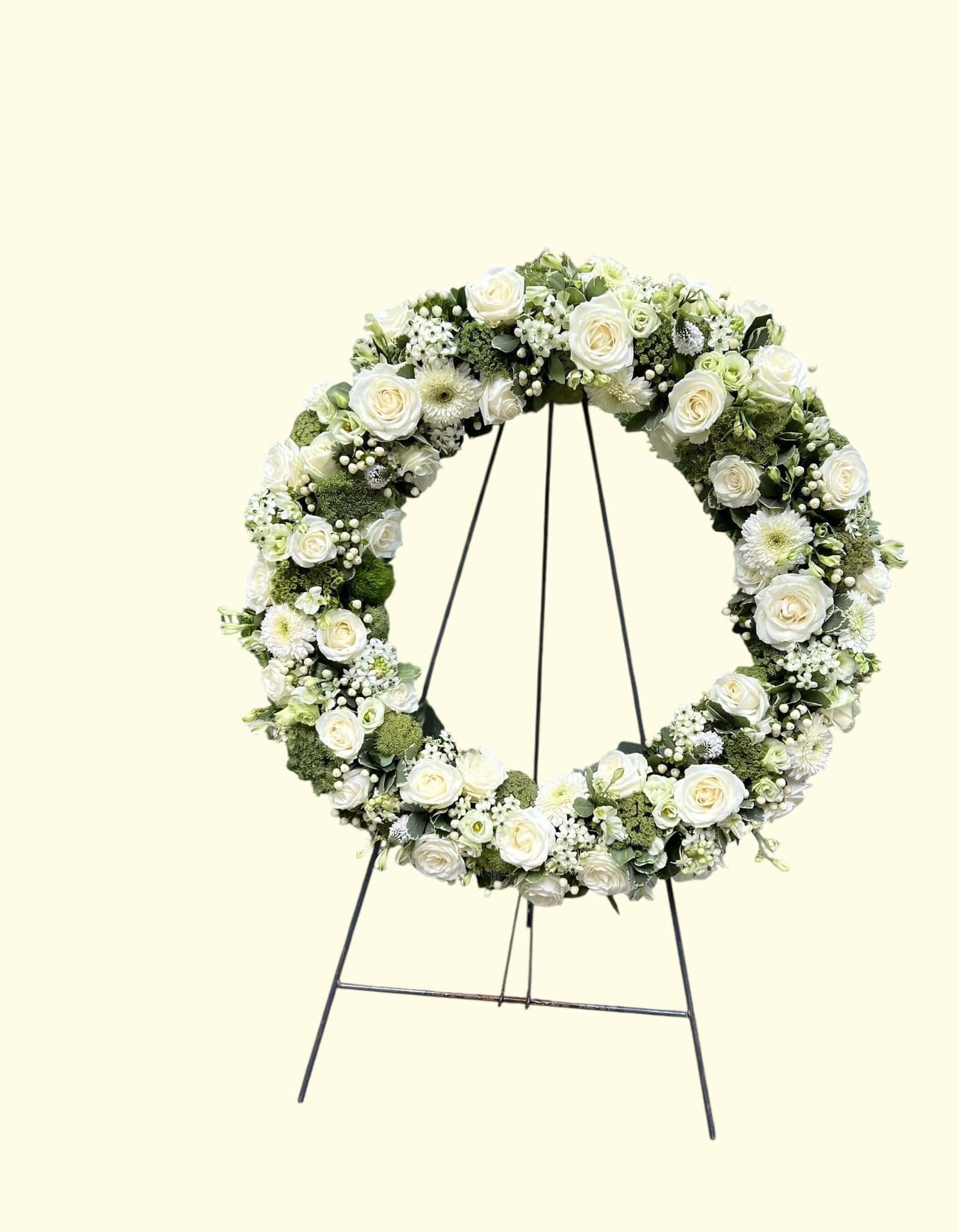 Onze verfijnde ajourkrans straalt in puur wit rust en klasse uit. Rijkelijk gevuld met handgestoken seizoensbloemen rondom een open, luchtige basis, biedt dit bloemwerk een serene uitstraling die perfect past bij elk afscheid.