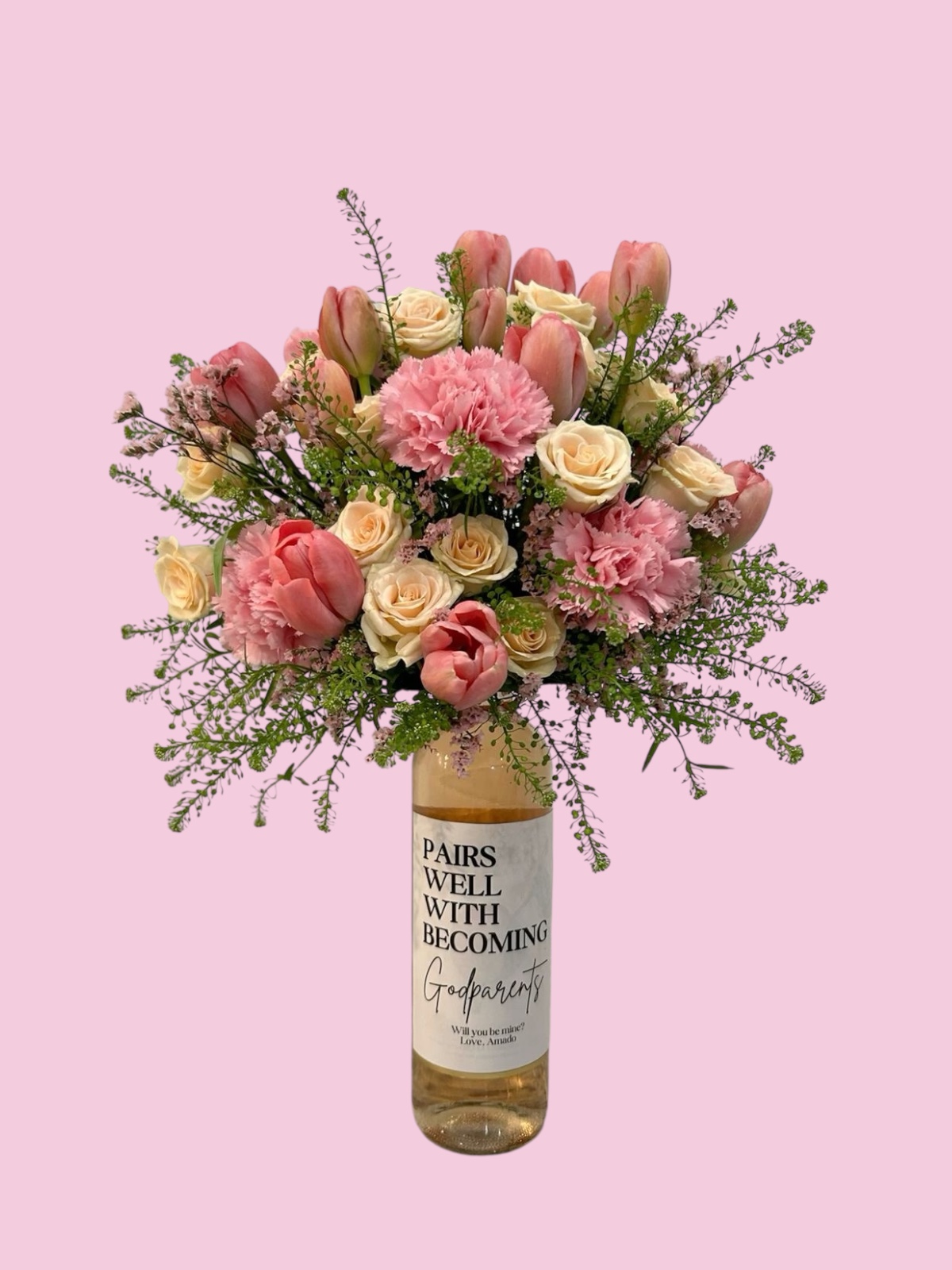 De toef bloemen op de fles kan in alle kleuren gemaakt worden – laat in de opmerkingen weten welke kleur jouw voorkeur heeft. Kies zelf de wijn die het beste past: rood, wit of rosé. Zo creëer je een uniek en persoonlijk cadeau dat zowel oogstrelend als smaakvol is.