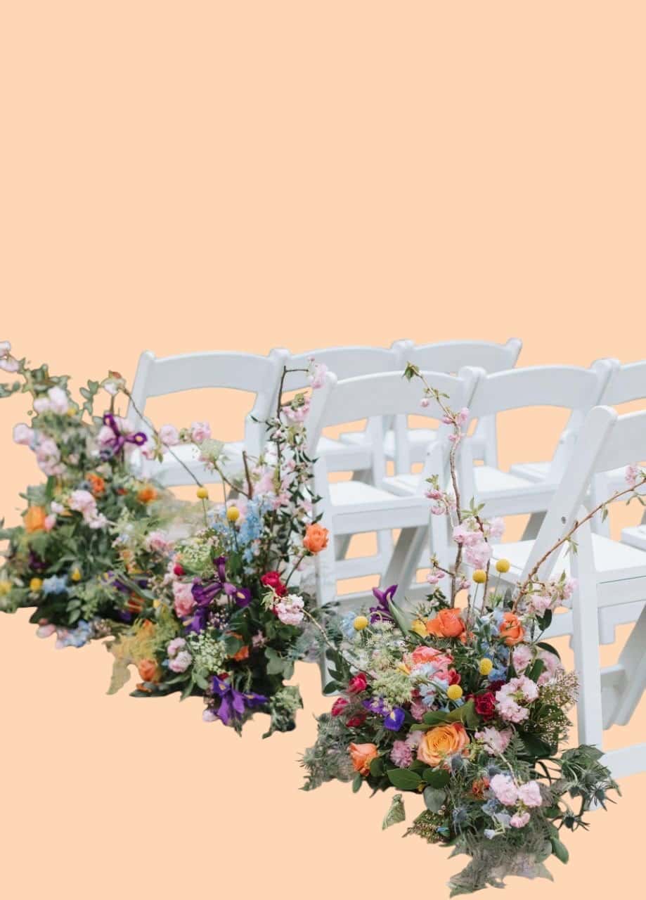 Onze Bloemen Tuintjes zijn luchtige bloemstukken die langs het gangpad van de ceremonie worden geplaatst – perfect om jullie trouwpad om te toveren tot een sfeervol bloemenpad. Deze variant is gemaakt in veldstijl, met een speelse mix van wilde bloemen en groen, losjes gestoken voor een natuurlijke uitstraling.