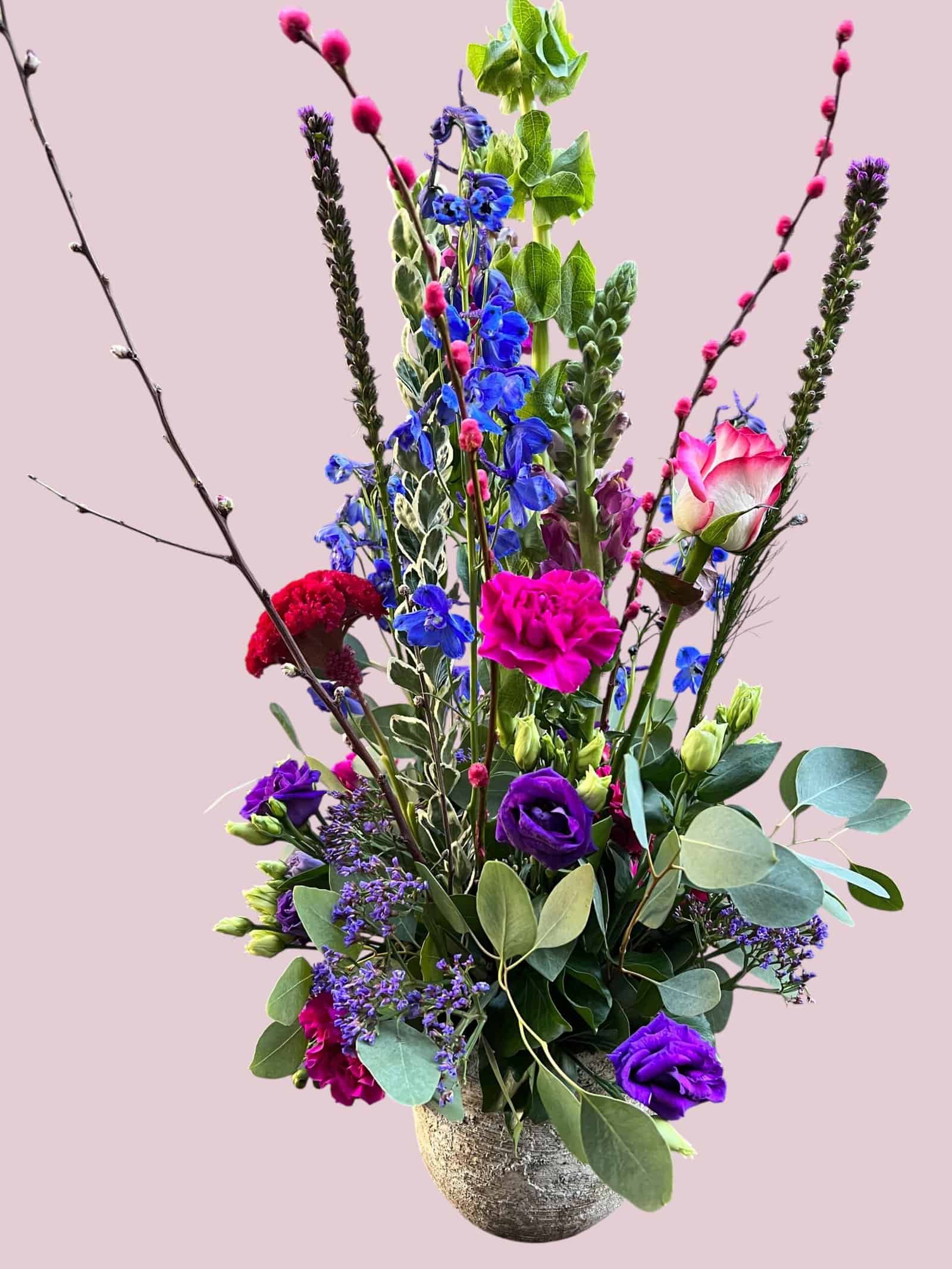 Op de afbeelding zie je een combinatie van rode, roze en blauwe tinten, maar wij maken deze bloemstukken geheel op maat. Kies zelf de kleuren die passen bij jouw thema, locatie of seizoen.