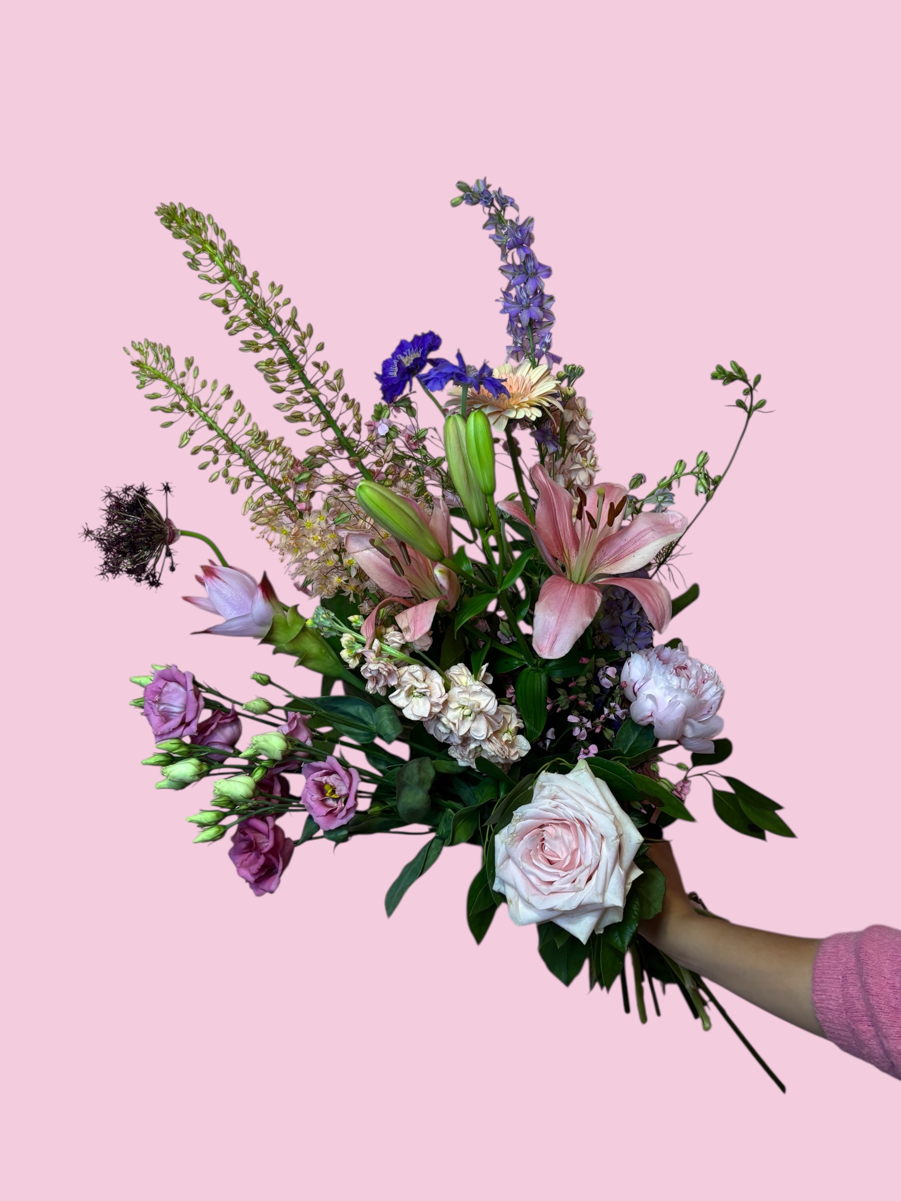 Het Boeket Goede Voornemens is samengesteld uit een harmonieuze mix van lichte, frisse bloemen en zachte groentinten die staan voor groei, balans en nieuwe kansen. De combinatie van heldere kleuren en speelse structuren geeft het boeket een optimistische, opbeurende en eigentijdse uitstraling.