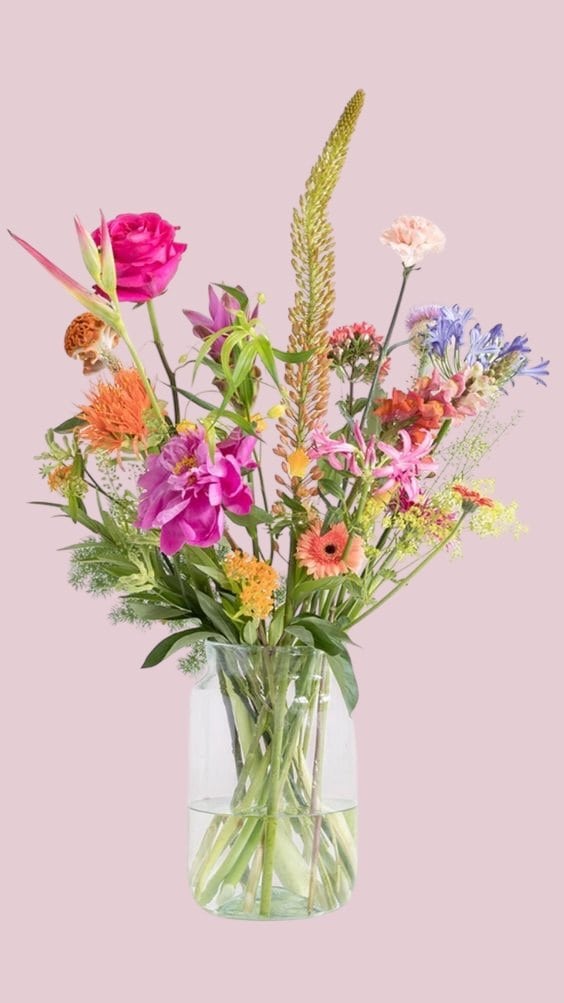 Een klassieke glasvaas, een weelderig boeket en verder niets. Geen poespas, puur bloemenpracht. Hierdoor past het in vrijwel elk interieur of decoratieconcept.