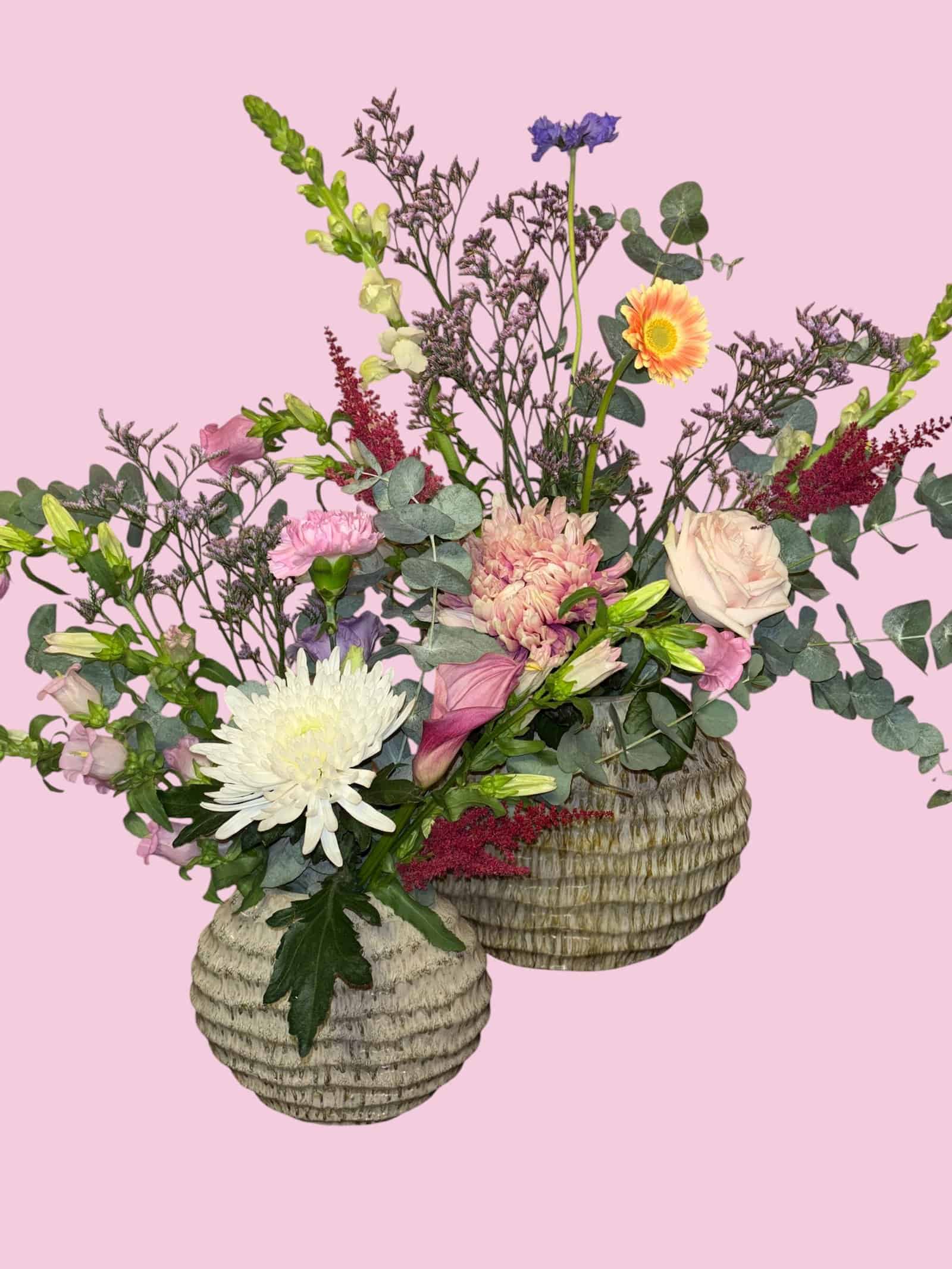 Het Boeket in Vaas Lima combineert pastelbloemen op een speelse manier, waardoor het een rustige en stijlvolle uitstraling krijgt. De ovale vaas maakt het geheel tot een moderne eyecatcher die prachtig staat op een tafel, vensterbank of bureau.