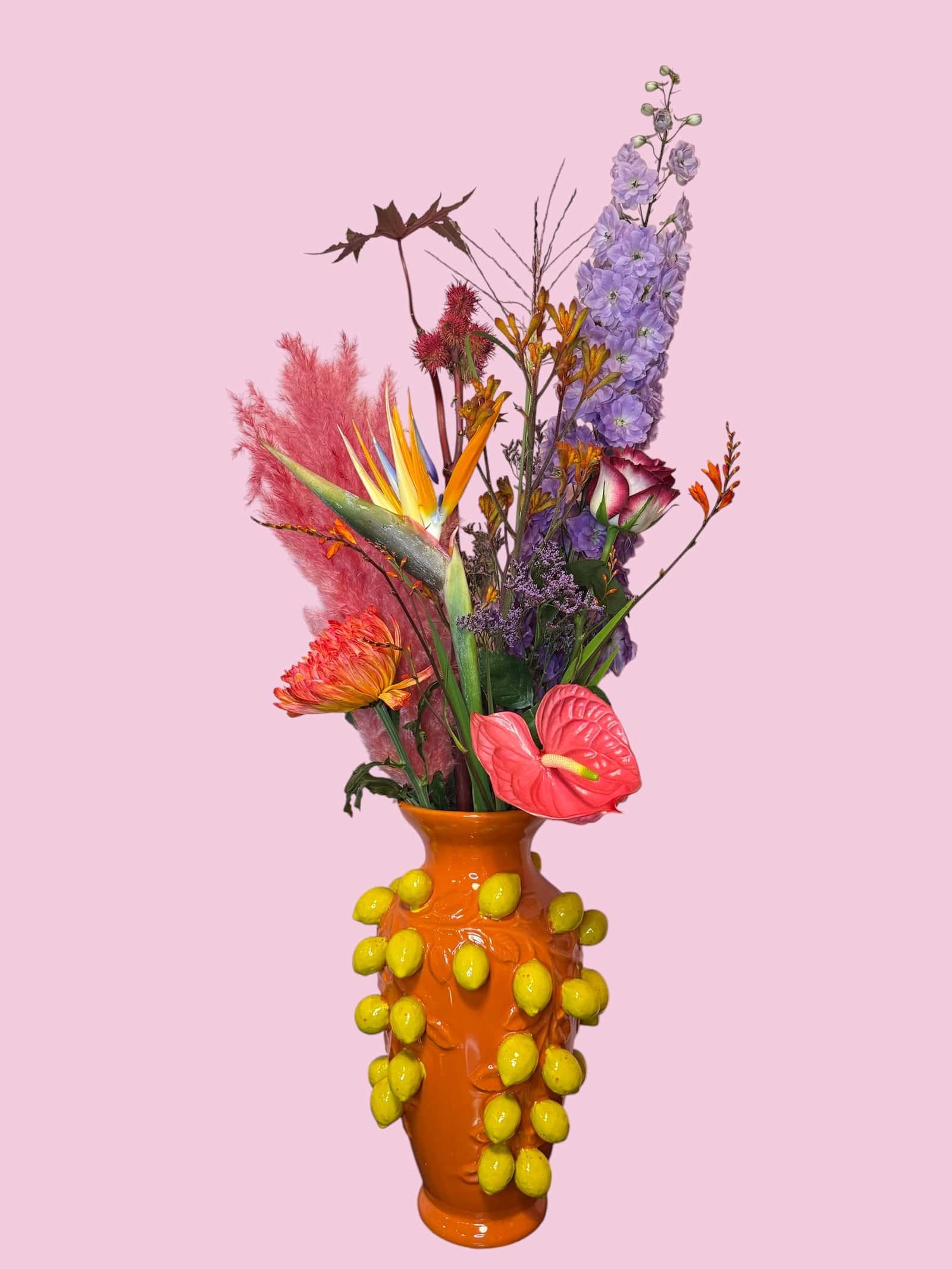Het Boeket in Vaas Tropical Party combineert bloemen in felle, tropische kleuren zoals oranje, roze, geel en groen. De speelse mix en de elegante vaas maken het boeket een opvallend en feestelijk accent in huis, op kantoor of op een speciale gelegenheid.