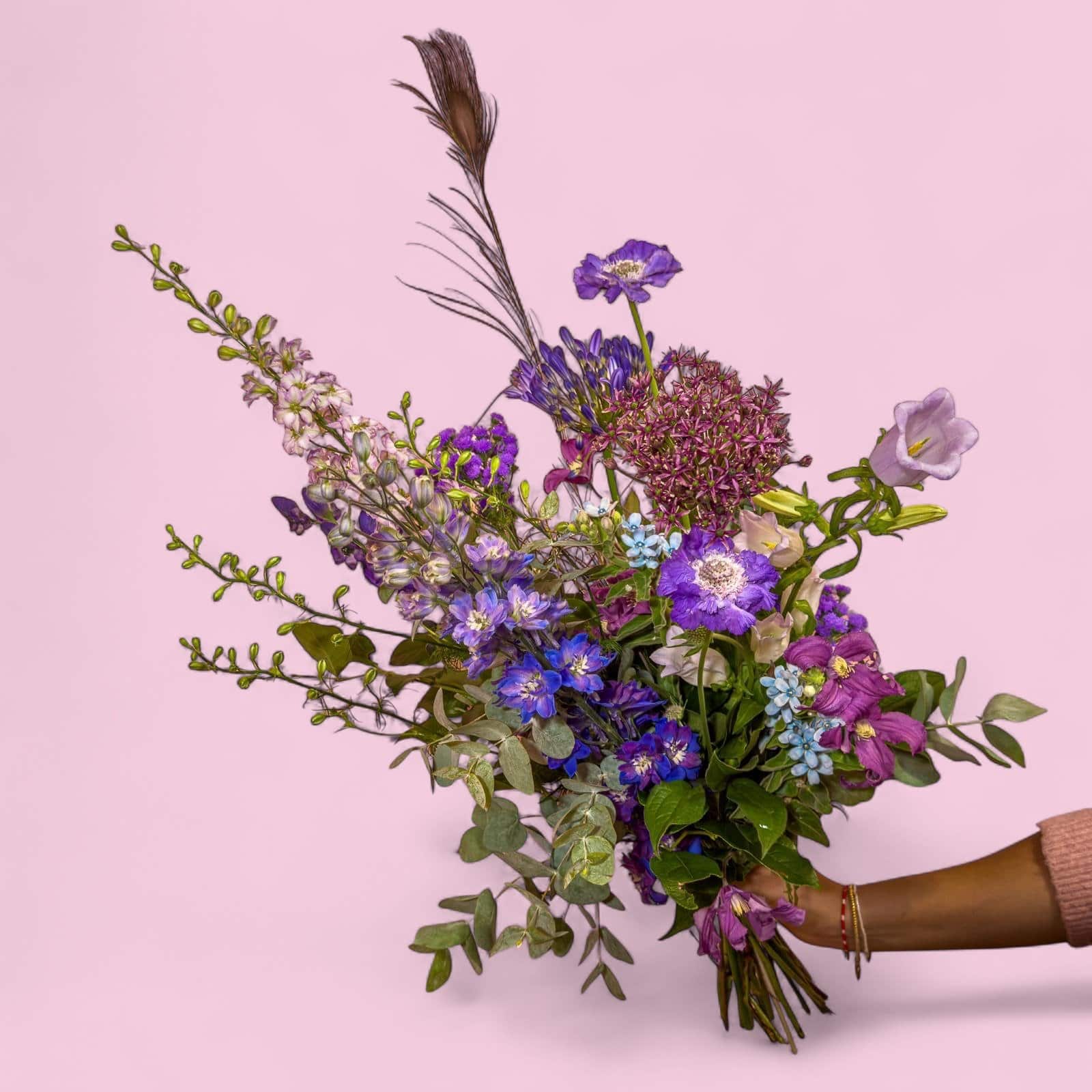 De diepe paarstinten combineren prachtig met het frisse blauw en zorgen voor een krachtige, maar ook kalmerende uitstraling. Perfect om iemand te verrassen, een ruimte op te fleuren of jezelf te trakteren op iets bijzonders. Dit boeket is stijlvol, modern en nét even anders dan het traditionele bloemenpalet.