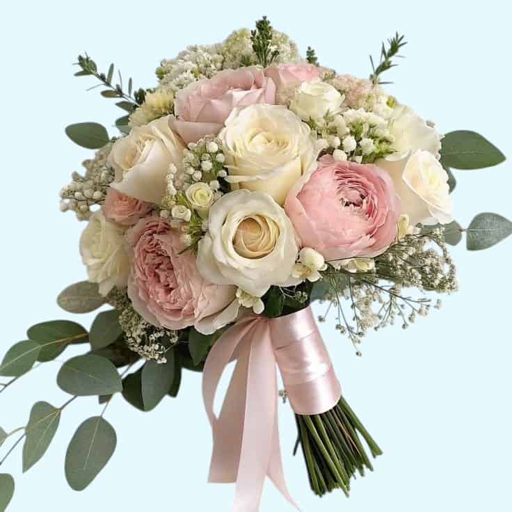 Bruidsboeket Annysia is een romantisch boeket met een zachte uitstraling. Het bestaat uit witte rozen, lichtroze ranonkels, luchtig gipskruid en geurige eucalyptus. Een prachtig losjes gebonden boeket met een frisse en elegante uitstraling – perfect voor een zachte, liefdevolle trouwdag. Afgebonden met prachtig zacht roze lint.