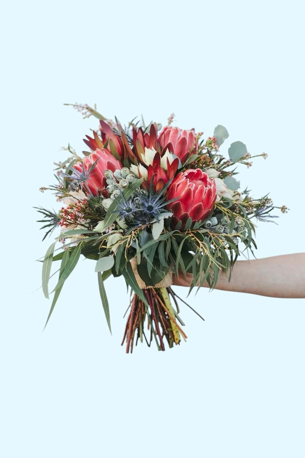 Bruidsboeket Protea is een opvallend bruidsboeket met een krachtige, exotische uitstraling. De indrukwekkende protea’s vormen het hart van dit boeket, gecombineerd met eucalyptus, blauwe distelbessen, waxflower en andere tropische elementen. Een perfecte keuze voor wie op zoek is naar iets unieks en stijlvols buiten de gebaande paden.
