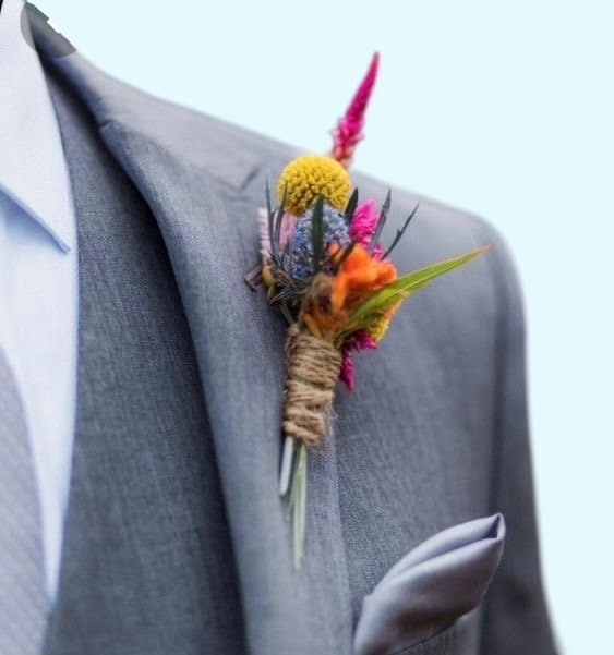 Deze corsage past prachtig bij natuurlijke en kleurrijke boeketten zoals Seizoen, Protea of Stoer Blauw.