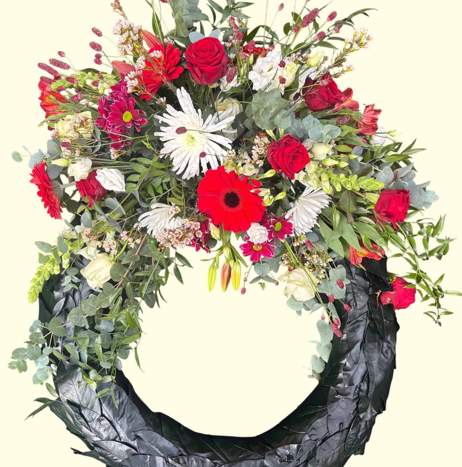 De krans is handgestoken op een stevige basis van verse groene bladeren en voorzien van een elegante toef bloemen. Denk aan rode rozen, witte lisianthus, anjers of seizoensbloemen – zorgvuldig gekozen voor een stijlvolle en ingetogen uitstraling. De kleuren kunnen worden aangepast op verzoek, bijvoorbeeld met accenten in blauw of goud.
