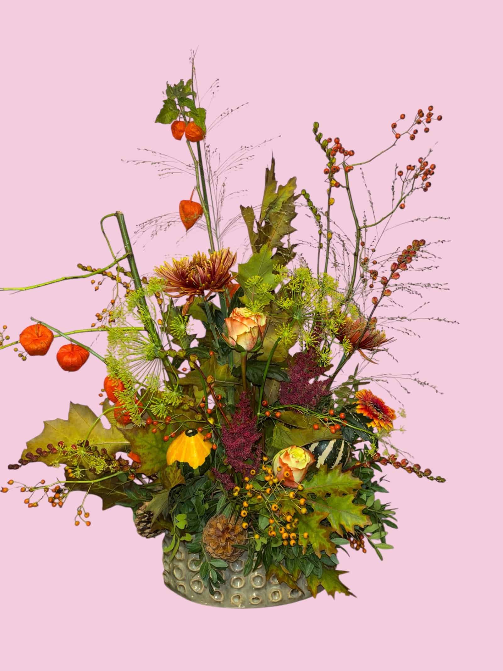 Elk Herfst Stuk Elegant wordt met liefde en vakmanschap door onze bloembinders gemaakt. Omdat we werken met verse seizoensbloemen, kan het stuk iets afwijken van de afbeelding. Zo ontvang je altijd een uniek en persoonlijk herfstarrangement.