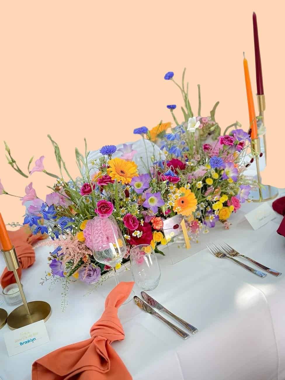 Een langwerpig en luchtig bloemstuk dat perfect is als tafeldecoratie voor de bruiloft. Het voorbeeld op de foto is uitgevoerd in een frisse veldstijl, losjes gestoken met wilde bloemen en diverse groentinten. Een speels en elegant stuk dat direct sfeer brengt aan lange dinertafels of buffettafels.