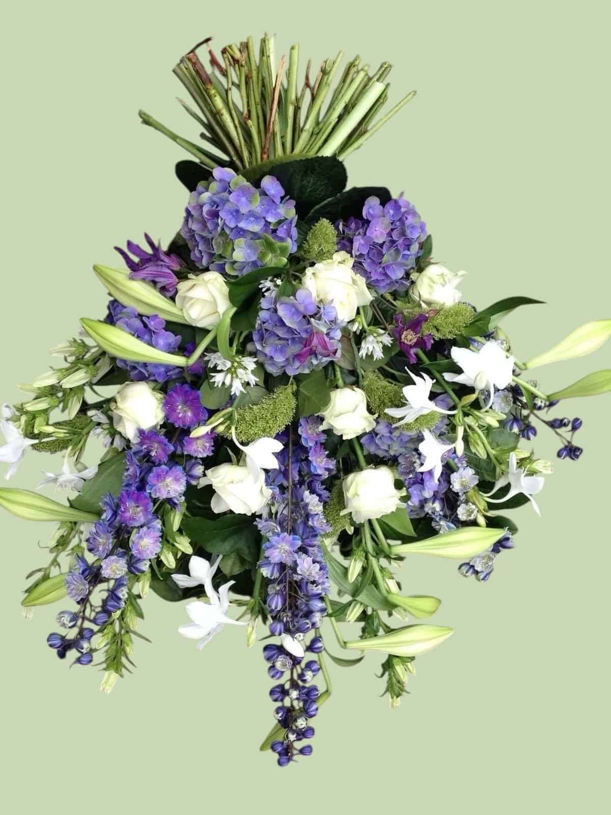 Dit stijlvolle rouwboeket combineert bloemen zoals delphinium, blauwe hortensia, witte rozen, lisianthus en gipskruid, afgewisseld met zilvergroen eucalyptus en fijn bladmateriaal. De harmonieuze mix van koele blauwtinten en helder wit zorgt voor een ingetogen, maar krachtige boodschap van liefde en herinnering.