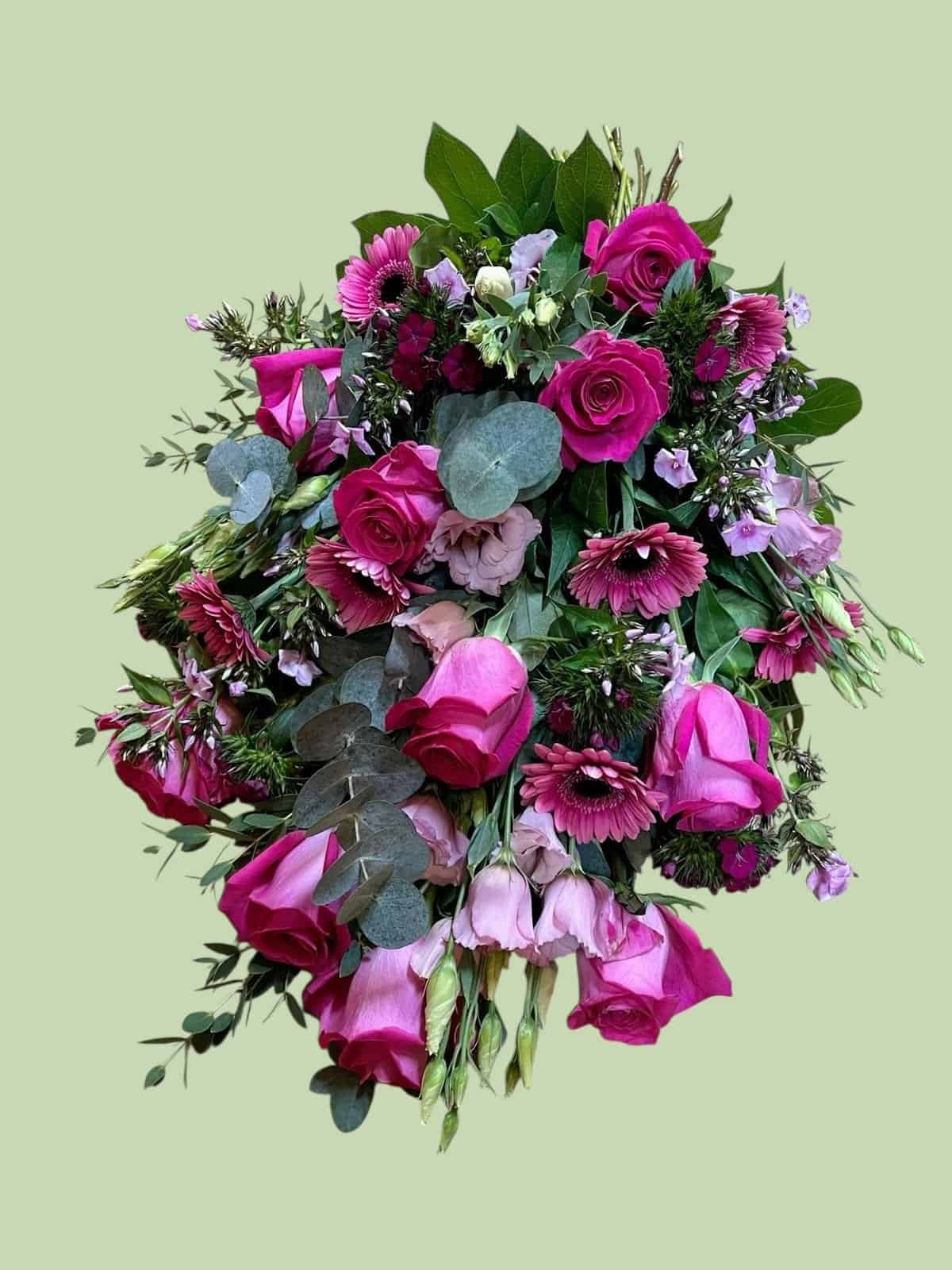 Ons rouwboeket roze wordt met zorg samengesteld uit verse bloemen zoals rozen, pioenen, lisianthus en andere zachte accenten. Je kunt de tinten en bloemsoorten naar wens aanpassen, zodat het boeket helemaal aansluit bij jouw persoonlijke gevoelens en stijl.