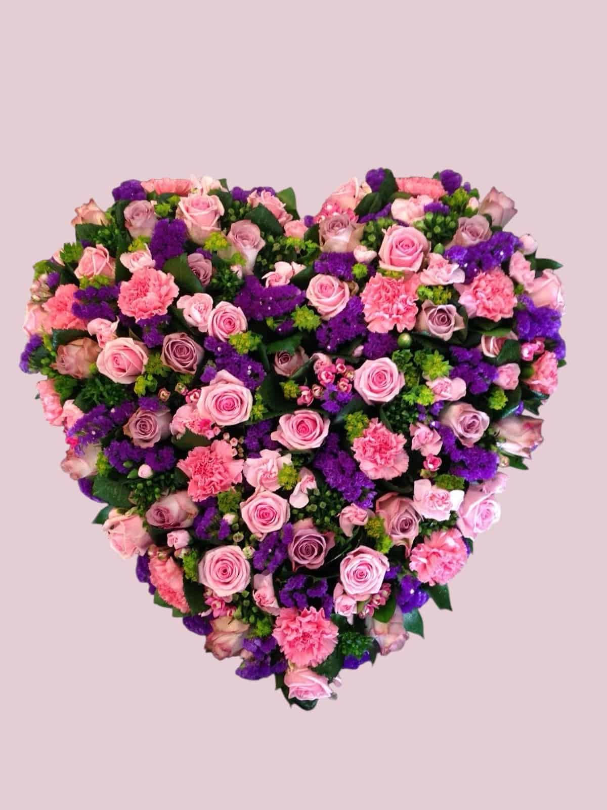 Vier liefde en tederheid met ons schitterende Rouwhart Sterk, gevuld met een rijk palet van onder andere roze rozen, prachtige lyciantes en paarse limonium. Dit hartvormige arrangement brengt een harmonieuze, elegante uitstraling die elke gelegenheid extra bijzonder maakt. Dit hart is beschikbaar in vier maten: Ø 33 cm, Ø 42 cm, Ø 54 cm Ø 65 cm en natuurlijk is maatwerk mogelijk in overleg.