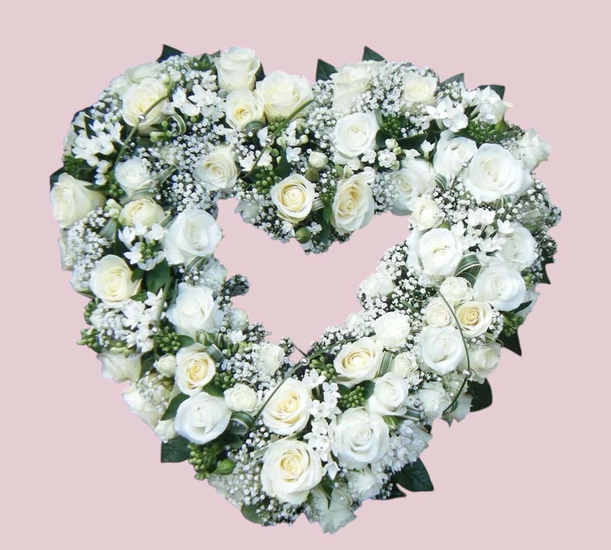 Vier de zachte herinnering met ons elegante Rouwhart Wit, een opengewerkt bloemenhart met een diameter van 45 cm dat verfijning en sereniteit uitstraalt.