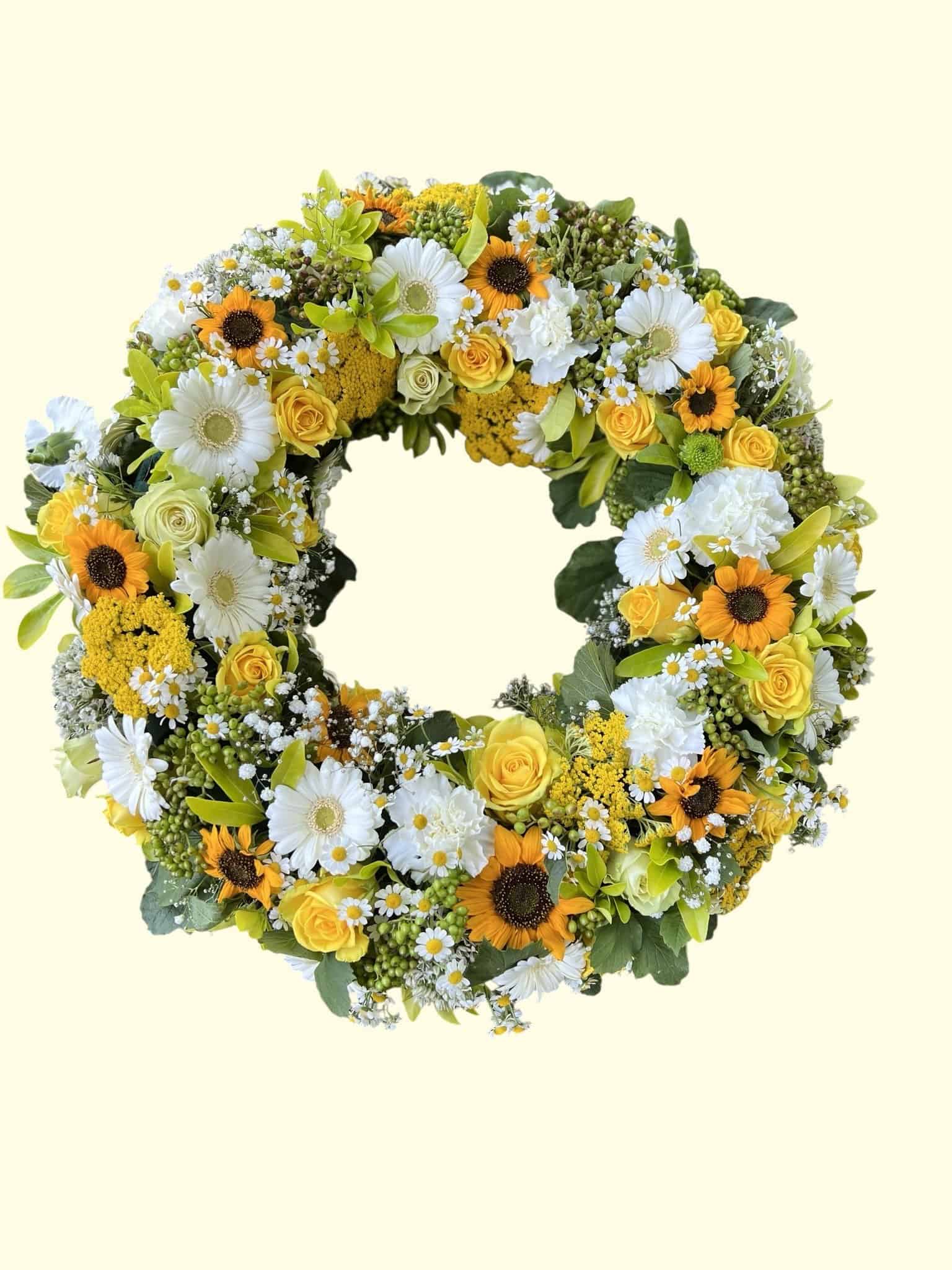 Deze prachtige Rouwkrans Zonnebloemen combineert de warmte van zonnebloemen met een subtiele mix van veldbloemen in wit- en geeltinten. Een frisse, waardige laatste groet die symbool staat voor hoop en herinnering.