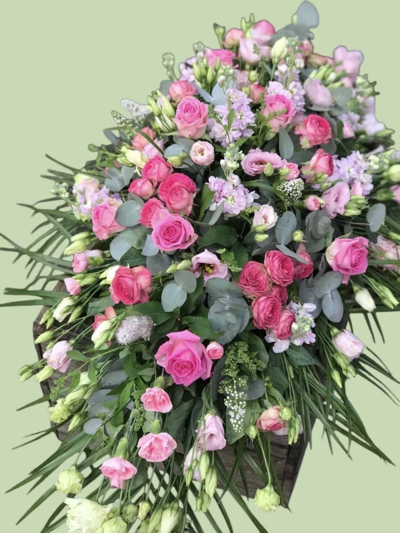 Dit druppelvormige rouwstuk wordt handgestoken met seizoensbloemen die passen bij jouw gekozen kleurenpalet. Kies bijvoorbeeld voor: