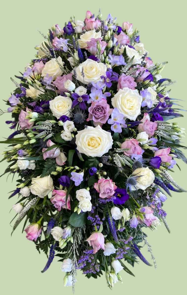 Met de frisse witten van de rozen en de diepe paarse tinten van lyciantes straalt dit rouwstuk rust en waardigheid uit. Het klassieke ontwerp met strakke lijnen benadrukt de elegantie en respect die het afscheid verdient.