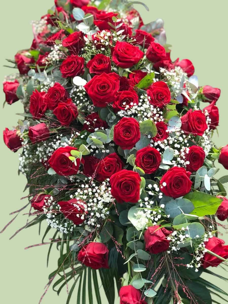 Onze ervaren bloembinders stellen elk rouwstuk met grote zorg samen en plaatsen de bloemen nauwkeurig in een vochtige steekschuimring. Zo blijven de rozen optimaal vers en behoudt het stuk zijn volle, stijlvolle vorm. Door het gebruik van dagverse en seizoensgebonden materialen kan het groen licht variëren, maar de krachtige rood-groene uitstraling blijft altijd centraal staan.