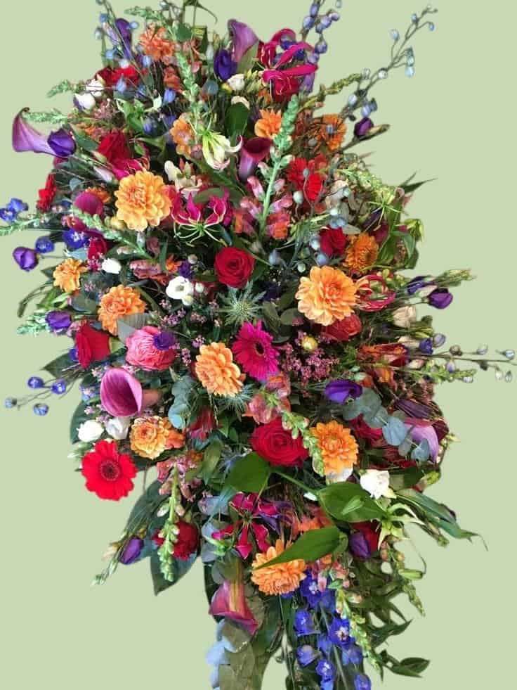 Het rouwstuk wordt opgemaakt met een seizoensgebonden mix van bloemen zoals rode rozen, gerbera’s, leeuwenbekken, dahlia’s en andere warme bloeiers. Hoewel de exacte soorten per seizoen kunnen variëren, blijft de karakteristieke stijl altijd hetzelfde: rijk, warm en stijlvol. Dit stuk is verkrijgbaar in meerdere formaten en kan eventueel op maat worden aangepast aan jouw wensen.