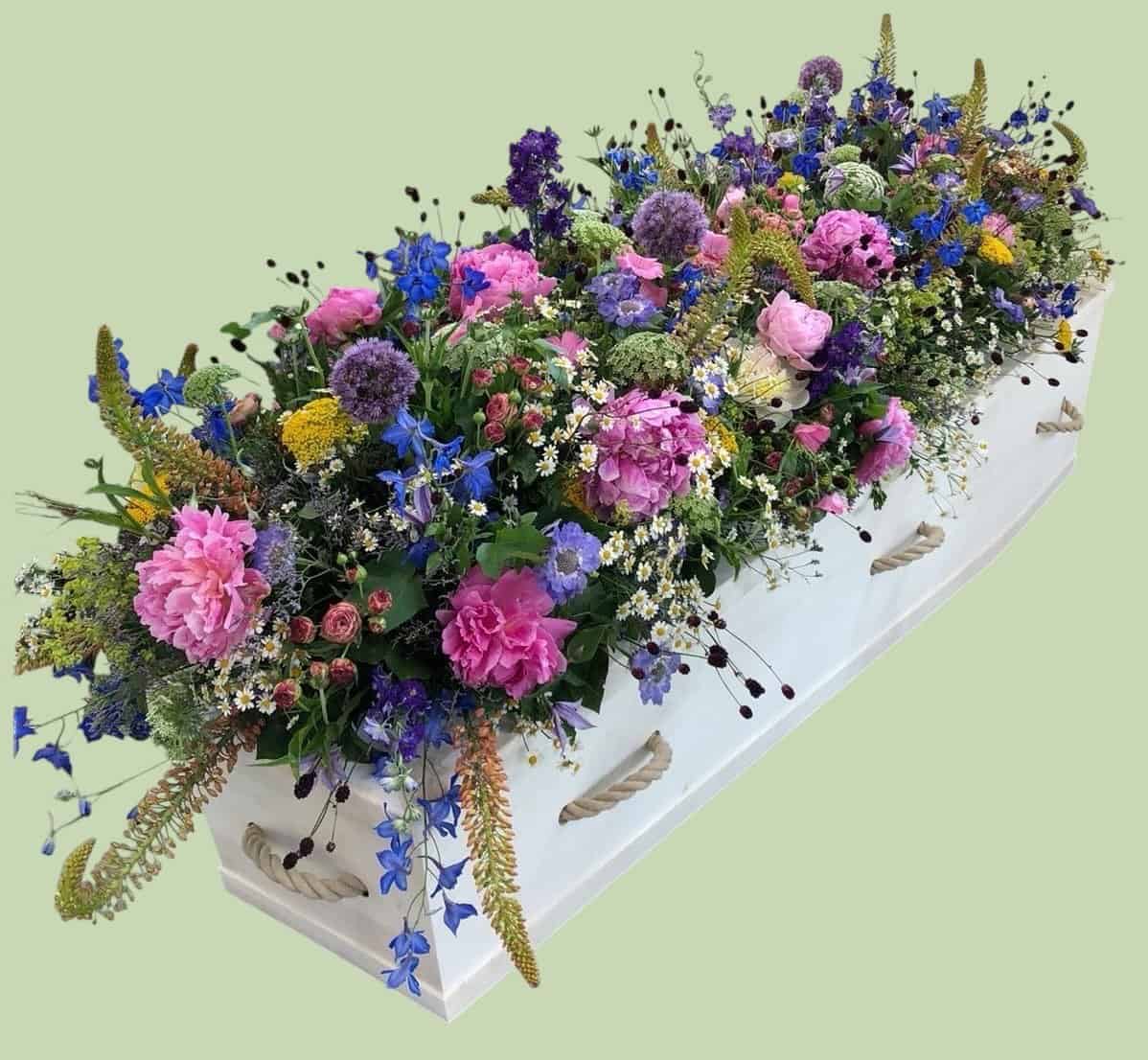 Onze kistbedekking bestaat uit een uitbundige mix van seizoensgebonden veldbloemen zoals korenbloemen, margrieten, phlox, fluitekruid en siergrassen, in een warm palet van rood, roze, geel en paars. De losse, natuurlijke compositie weerspiegelt de spontaniteit en levenskracht van een wilde tuin – een persoonlijk en oprecht eerbetoon aan je dierbare.