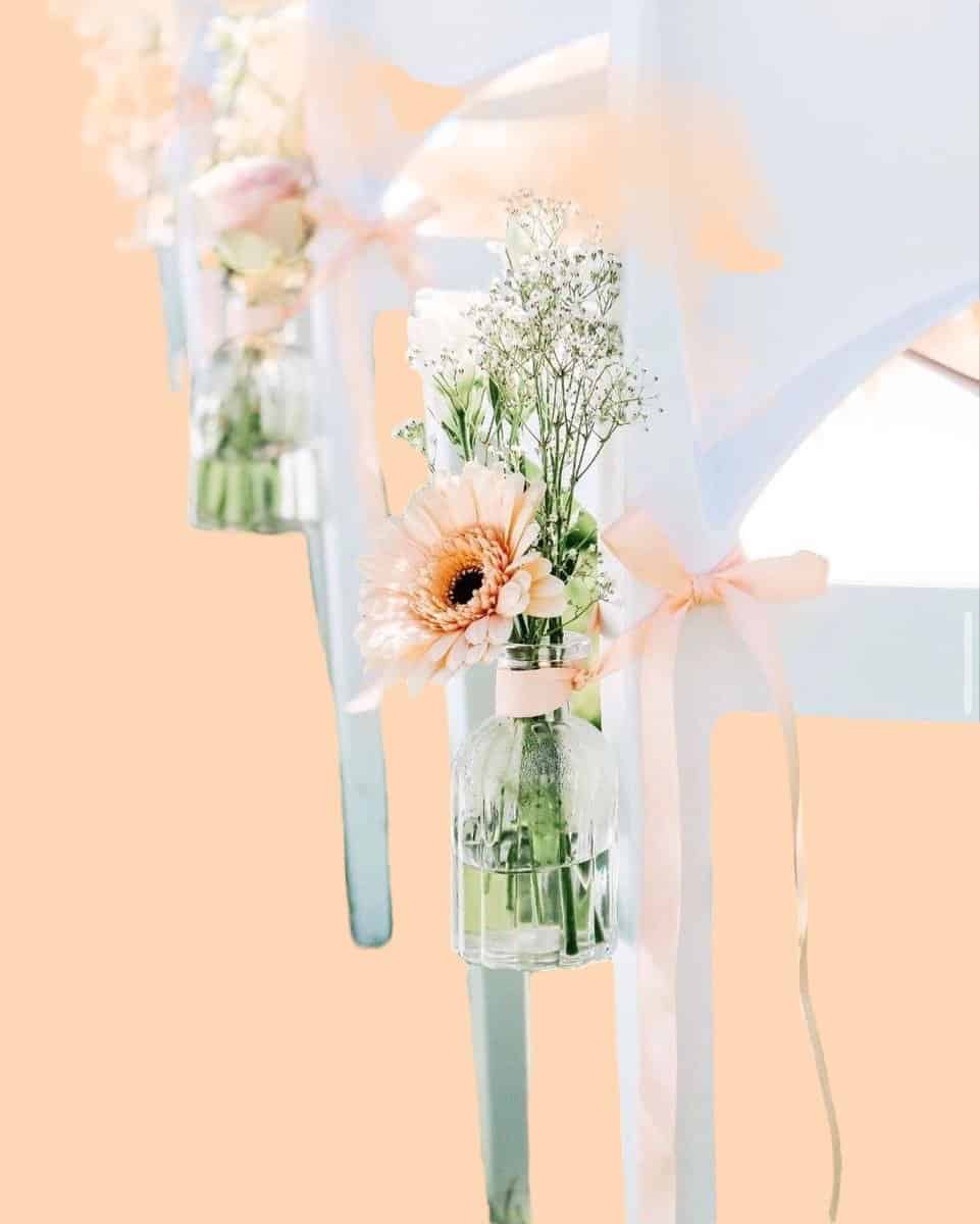 De vaasjes worden zorgvuldig aan de stoelen bevestigd met een lint in een kleur die bij jullie thema past. Denk aan klassiek wit, zacht pastel of juist vrolijk kleurrijk. De bloemen kunnen net zo goed aangepast worden.