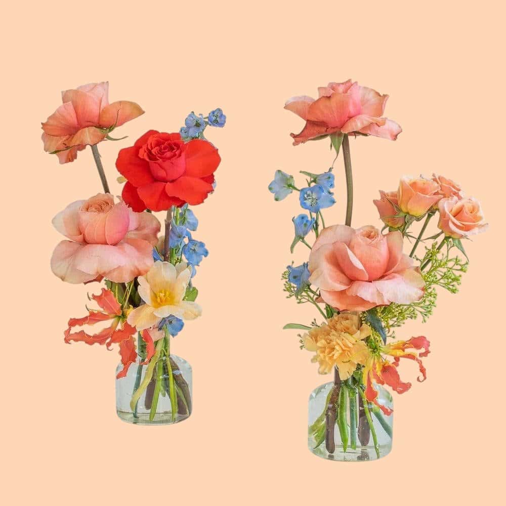 De foto is een sfeerbeeld. De vaasjes kunnen volledig worden afgestemd op jullie bruiloftsstijl – qua kleuren, bloemen en sfeer. Wil je liever een chique of juist kleurrijke look? Alles is mogelijk. Houd wel rekening met een eventuele meerprijs bij bijzondere wensen of luxe bloemen.