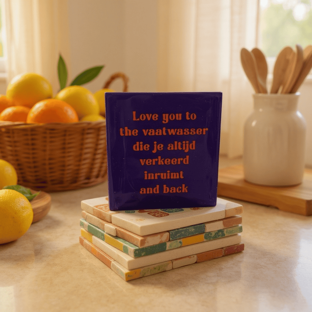 Voor de echte huishoudhumor! Dit tegeltje met de tekst “Love you to – the vaatwasser die je altijd verkeerd inruimt and back” is een grappige en liefdevolle knipoog voor je partner of huisgenoot. Perfect om een glimlach tevoorschijn te toveren in de keuken.
