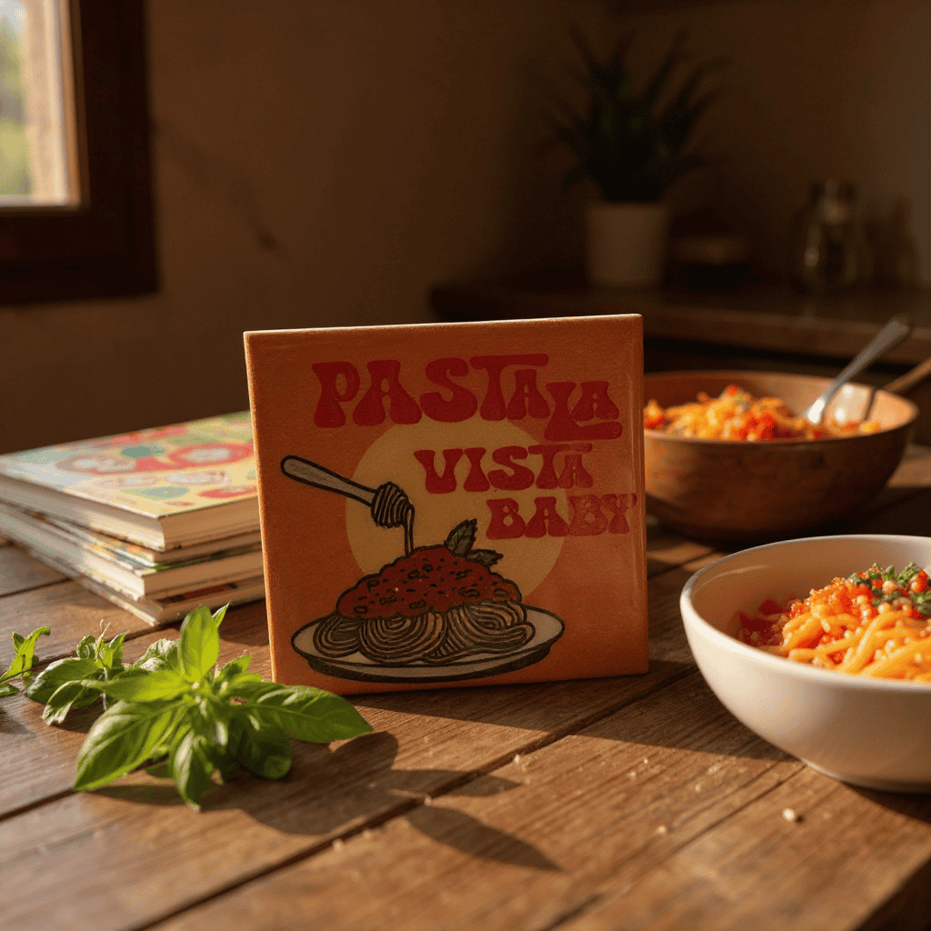 Voor de echte pastaliefhebber of foodies met humor is dit tegeltje een must-have! De tekst “Pasta la vista baby” brengt een vrolijke knipoog naar je favoriete Italiaanse gerechten en staat leuk in de keuken of eetkamer.