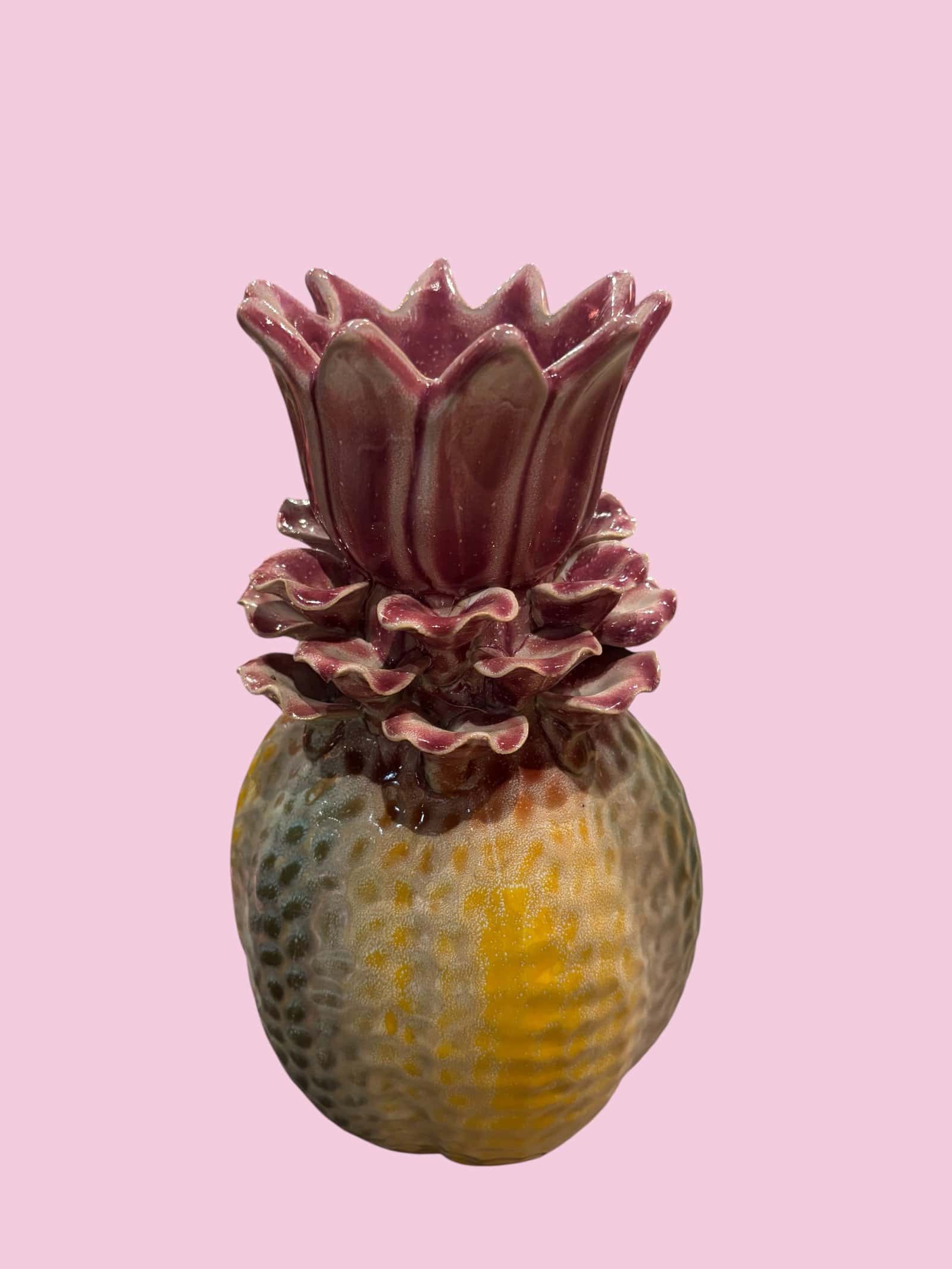 De Vaas Ananas is een speelse en kleurrijke eyecatcher voor je interieur. Met een vrolijke gele en groene onderkant en een roze kroon bovenop, brengt deze vaas meteen een gezellige en tropische sfeer in huis. Perfect om bloemen in te zetten of gewoon als decoratief object dat je interieur opfleurt.