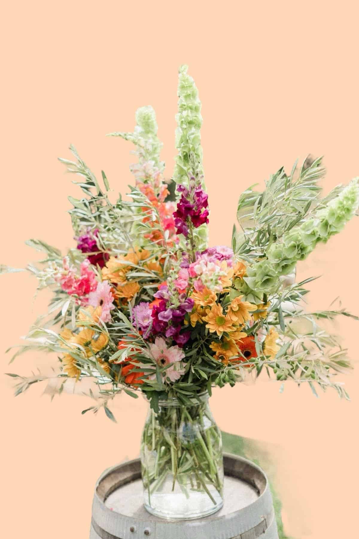 Een sfeervol en natuurlijk accent op jullie bruiloft: dit wild boeket in vaas is luchtig en speels gestoken in veldstijl, met een mix van kleurrijke seizoensbloemen. De glazen vaas geeft het geheel een frisse en elegante uitstraling – ideaal voor op statafels, ceremonietafels of als eyecatcher bij de entree.