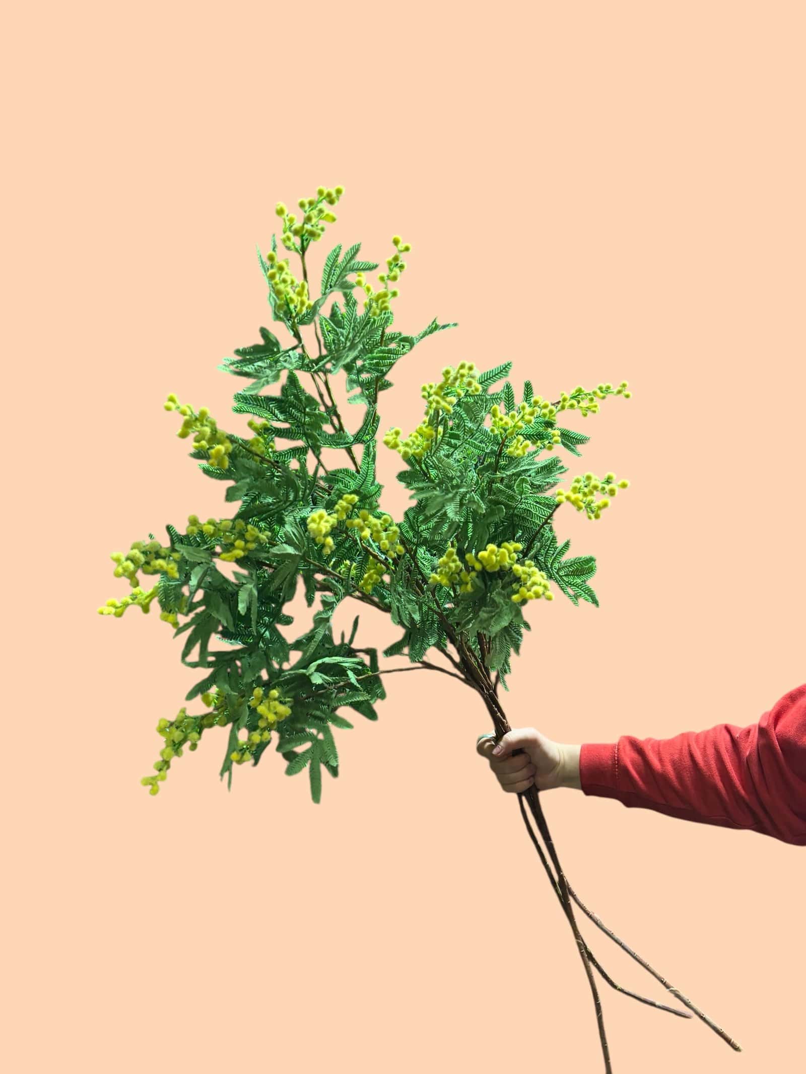 De Zijden Mimosa Tak valt op door haar zachte gele bloemen en levensechte uitstraling. Perfect om een vaas mee te vullen, te combineren in een zijden boeket of als vrolijk accent in een arrangement. Let op: op de voorbeeldfoto zijn drie stuks te zien; je ontvangt één tak per bestelling.